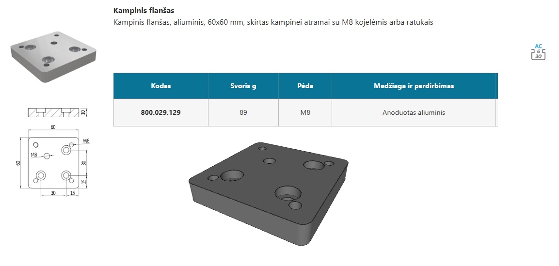 6 AC 22,5x22,5 mm, 2 griovelių 30 serijos aliuminis profilis