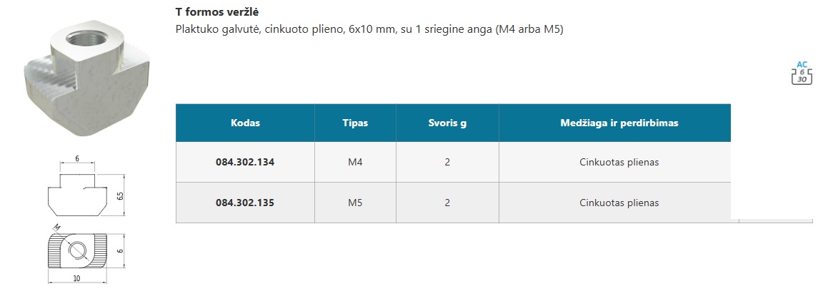 6 AC 4 griovelių aliuminio profilio profilis, 30x30 mm