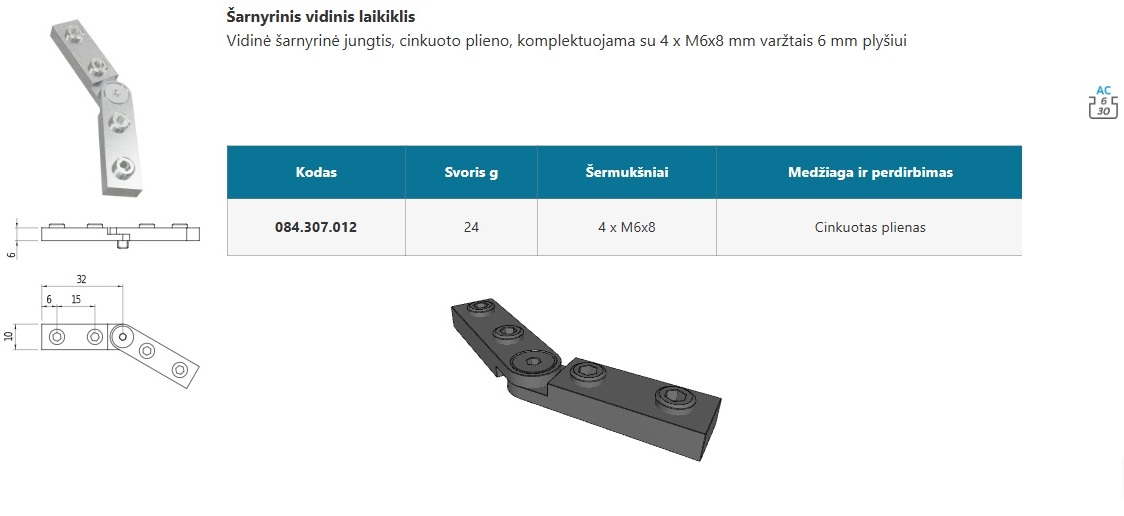 6 AC 13x30,5 mm, 2 griovelių 30 serijos aliuminis profilis