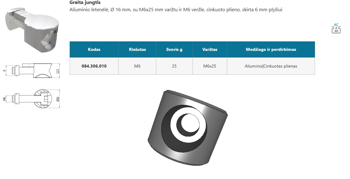 6 AC 13x22,5 mm, 1 griovelio 30 serijos aliuminis profilis