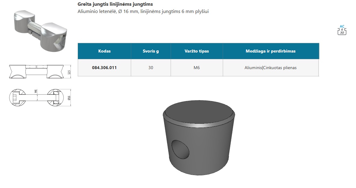 6 AC 13x30,5 mm, 2 griovelių 30 serijos aliuminis profilis