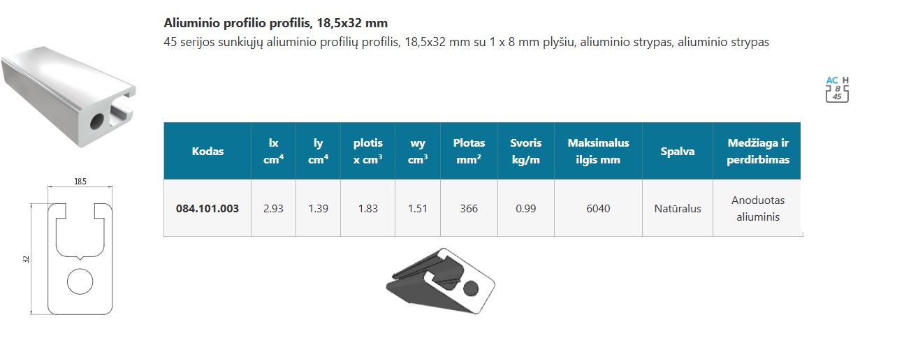 8AC 1 griovelio 45 serijos 18,5x32 mm aliuminio profilis