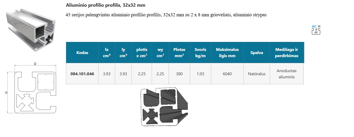 8AC 2 griovelių 45 serijos 32x32 mm sustiprintas aliuminio profilis