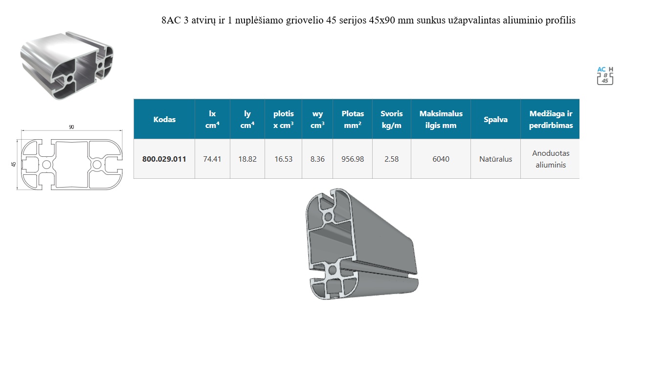 • 8AC 3 atvirų ir 1 nuplėšiamo griovelio 45 serijos 45x90 mm sunkus užapvalintas aliuminio profilis.