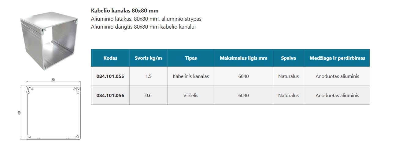 Aliuminio latakas kabeliui, 80x40 mm