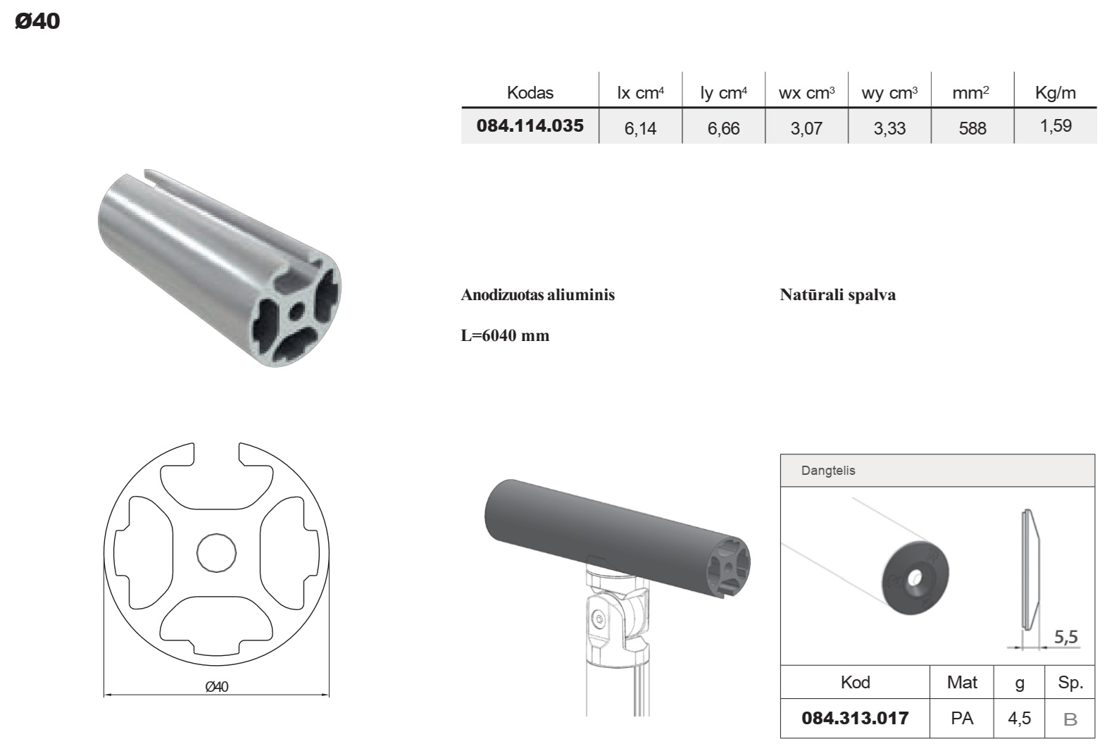IS tipo linijos laiptų turėklo vamzdis 40 mm skersmens su dviem grioveliais