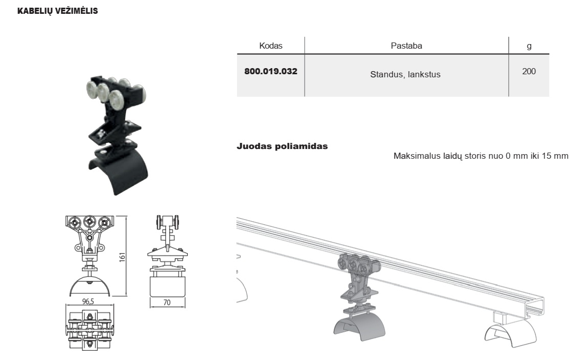 Vežimėlis 20 kg apkrovai, daugiafunkcinei, prie lubų tvirtinamai sistemai