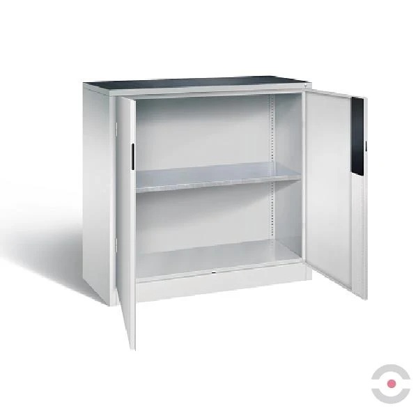 Plieninė dirbtuvių spintelė su padidinta apkrova su įvairia vidaus įranga su dvivėrėmis durimis, cinkuotomis lentynomis, 89 serijos spintelė.