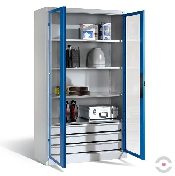 Plieninės dirbtuvių, biurų spintos ir spintelės su skaidriu akrilo stiklu varstomose duryse, 89 serija.