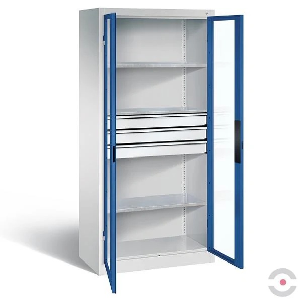 Plieninės dirbtuvių, biurų spintos ir spintelės su skaidriu akrilo stiklu varstomose duryse, 89 serija.