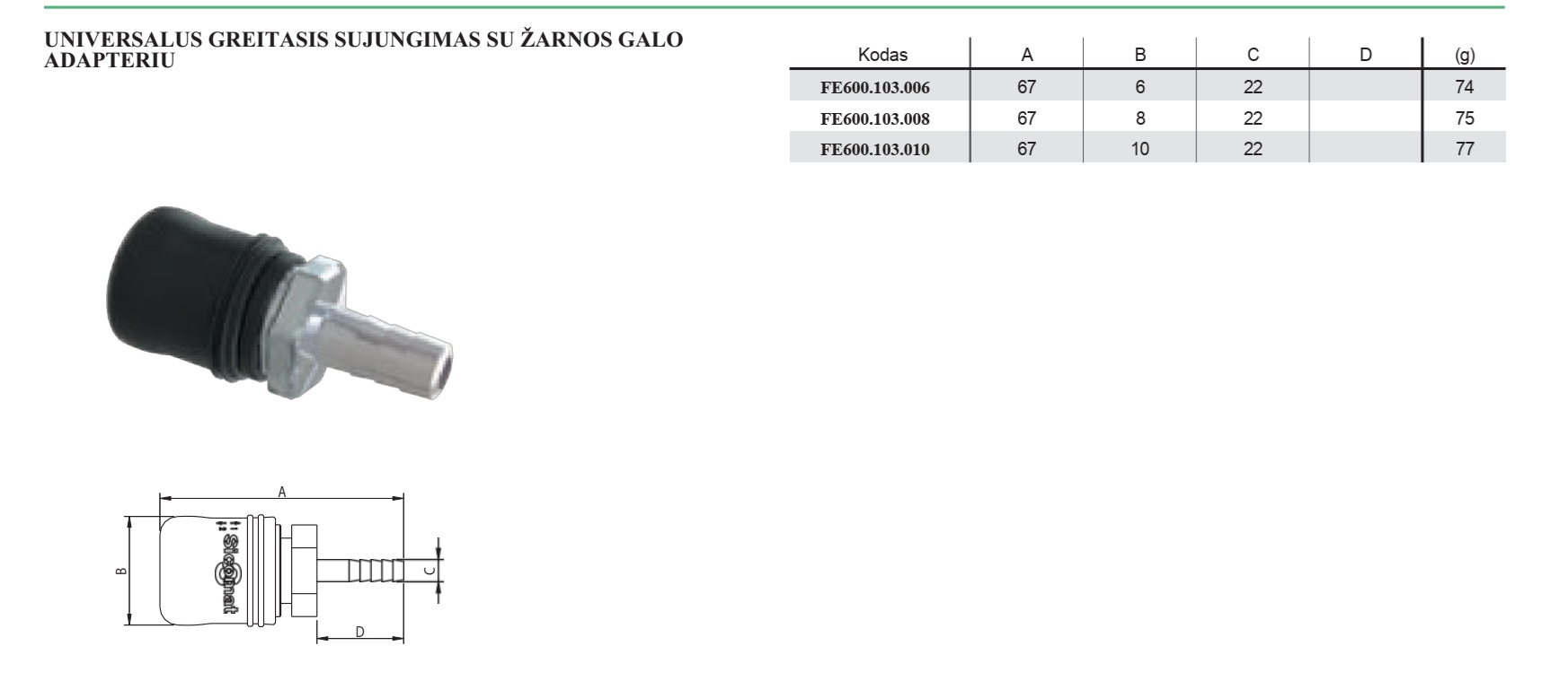 Universali plieninė greito sujungimo jungtis su antgaliu žarnai užmauti