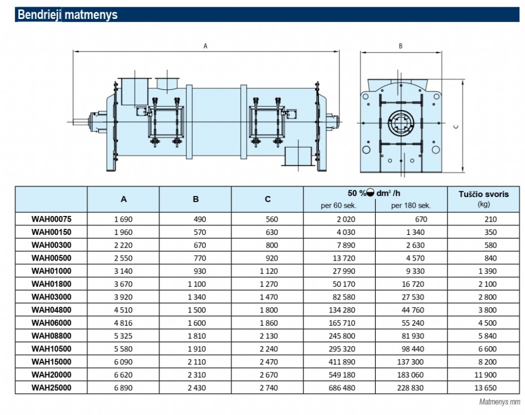 Našumas: 2 ~ 1 000 m3/h (nuo 1,2 iki 590 cfm), priklausomai nuo recepto ir maišytuvo konfigūracijos.